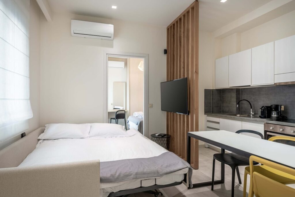 The bedroom features a sizeable wardrobe and a stylish vanity/desk area, providing excellent organization space before you step out to explore. The apartment easily sleeps three, thanks to the included sofa bed in the living room.
